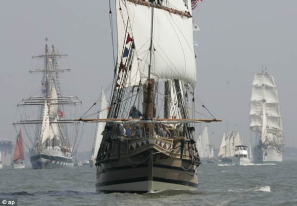 5月13日,在美国弗吉尼亚州詹姆斯敦小城,一群装扮成当年登上北美大陆的\"英国人\",在\"船长约翰·史密斯\"的率领下,喧嚣着登上了一艘仿400年前式样制成的帆船驶离港口,从而拉开了美国庆祝英国移民抵达北美大陆400