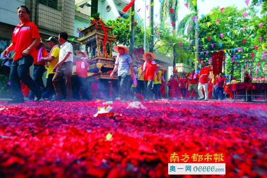 ●近千人的巡游仪仗队伍从三华村出发,乡民抬着关帝端坐的銮舆,举着彩旗,敲着锣柜走街串巷.