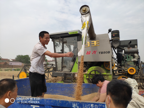 图为5月24日上午,沈丘县李老庄乡部分麦子开始收割,饱满的麦粒从收割机中流出,农民的脸上绽放出笑容.