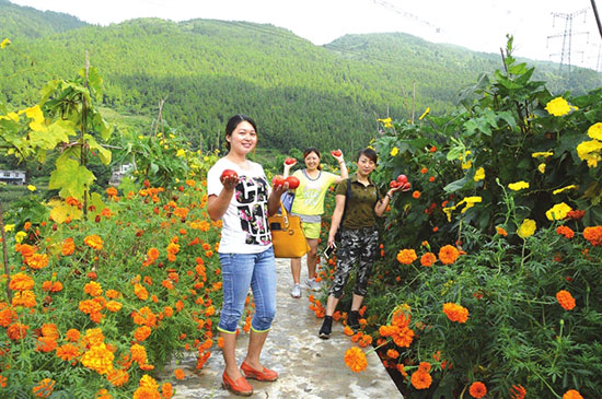 近日,在白马镇鱼光村塘坪蔬菜采摘园里,几名游客采摘完蔬菜后,行走在花园一样的人行道路上,十分惬意。