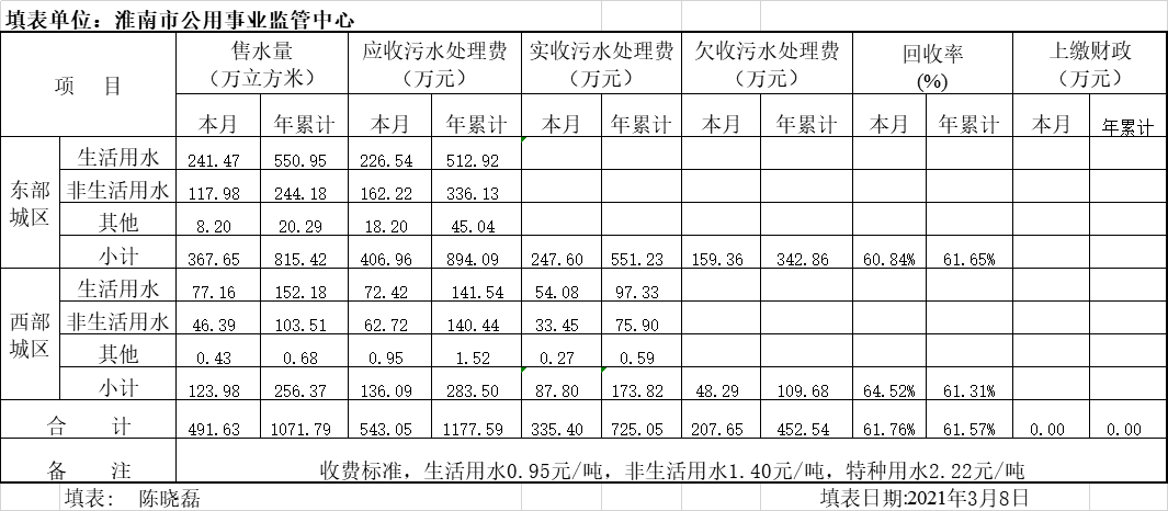 2021年2月份污水处理收费报表 政务公开 淮南市人民政府